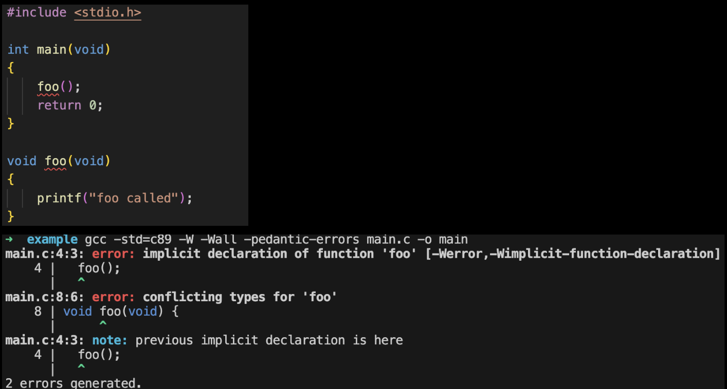 ANSI C(C89)에서는 함수 정의가 등장하기 전에 함수를 호출하면 컴파일러가 다음가 같이 가정