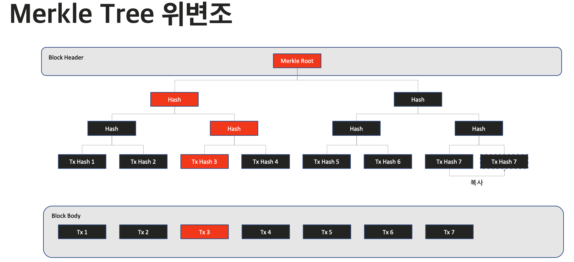 - 만약 거래가 변조되어 해시값이 변경된다면 Merkle Root의 값이 다르기 때문에 문제가 생긴것을 알 수 있다.