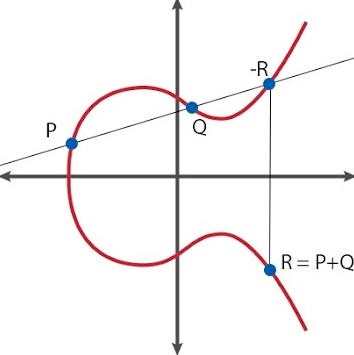 - ECC에서 곡선 위의 점 P, Q를 선택하면 우리는 이를 직선으로 연결하면 R를 찾을 수 있다.