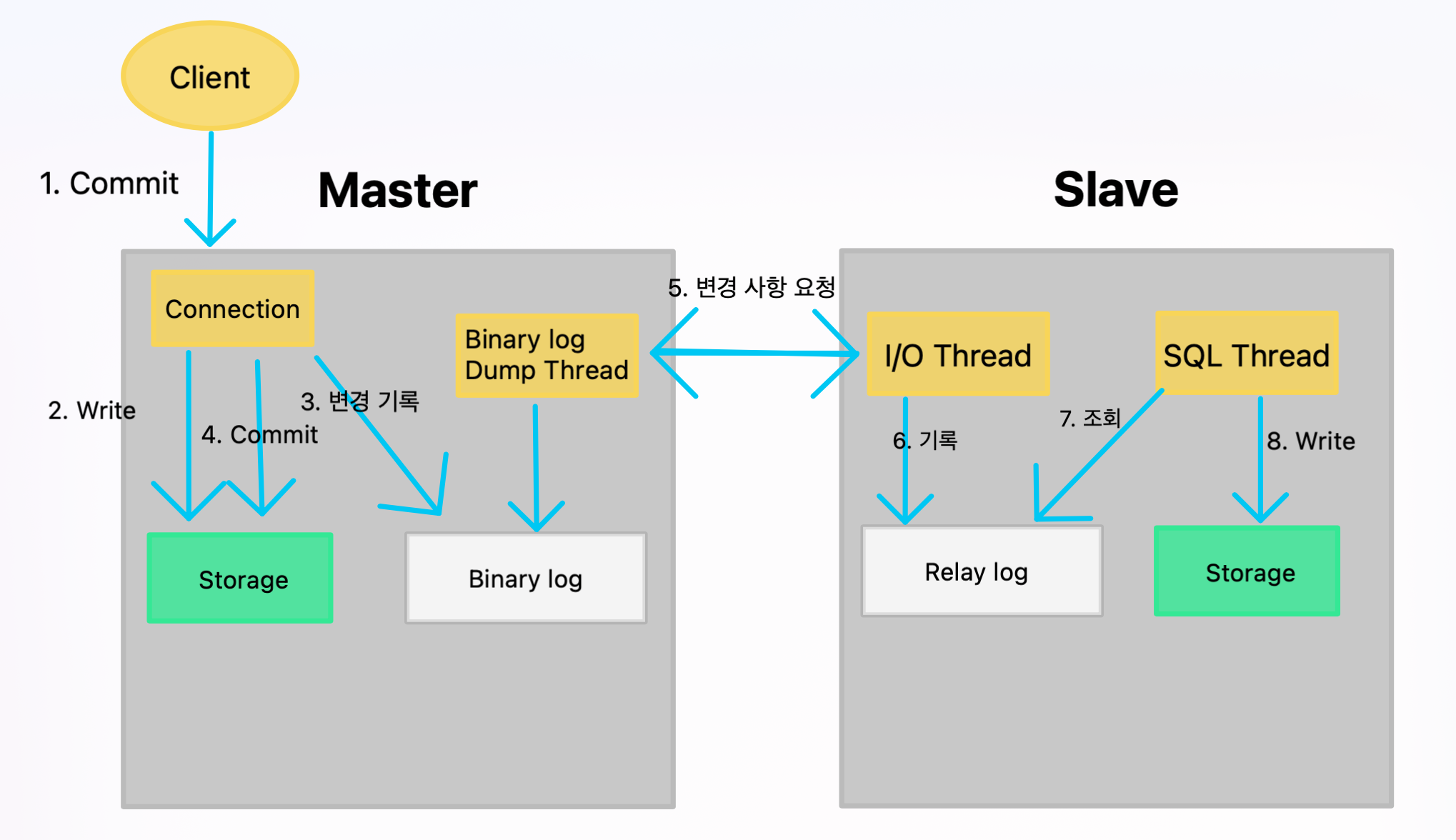 Master에 Commit 요청Flush)I/O Thread가 Binary Log Dump Thread에 변경사항을 요청SQL Thread가 Relay log의 변경사항을 조회바이너리 로그 파일 위치 기반 복제 방식