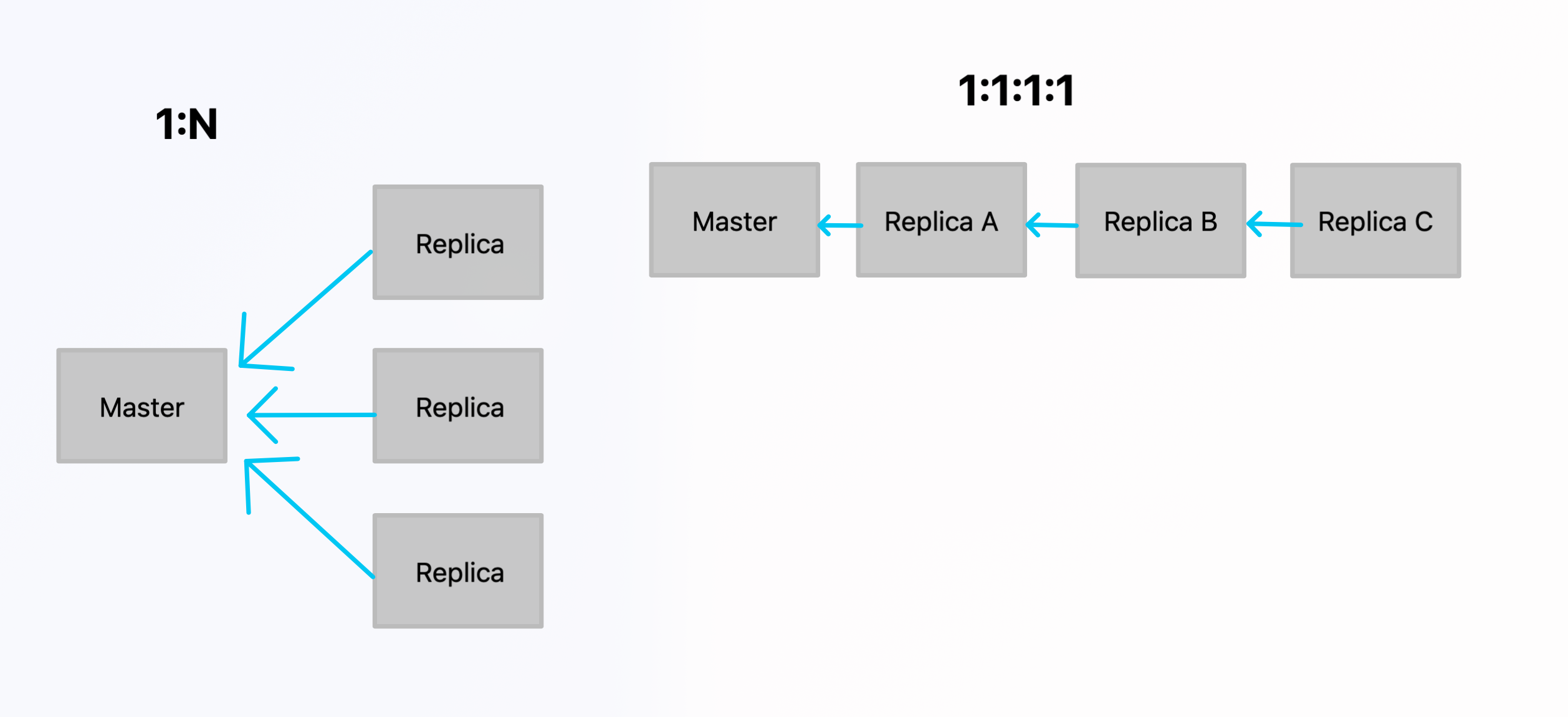 1:N개로 각 레플리카가 master를 바라보게 구성master를 바라보는 slave1를 slave2가 바라보게 구성slave는 readOnly여야한다. (master로는 slave의 데이터가 가지않으니)
