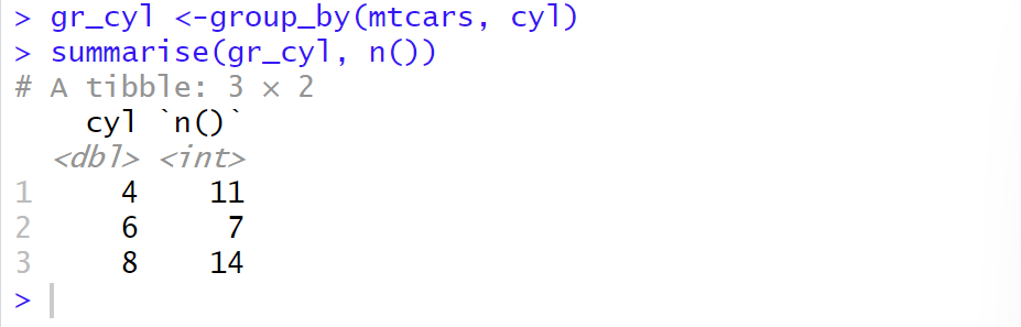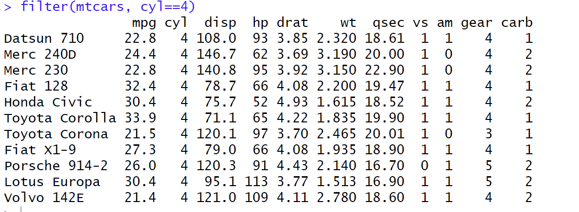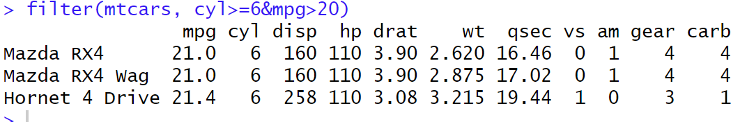 -> 6기통 이상의 자동차 중에서 연비가 20마일/갤런을 초과하는 차만 추출한 것임