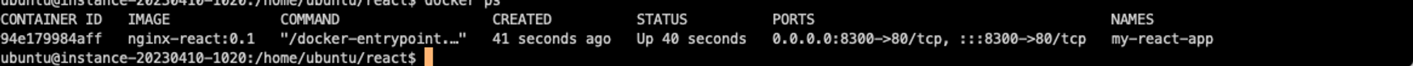 $ docker run -d --name my-react-app -p 8300:80 nginx-react:0.1
