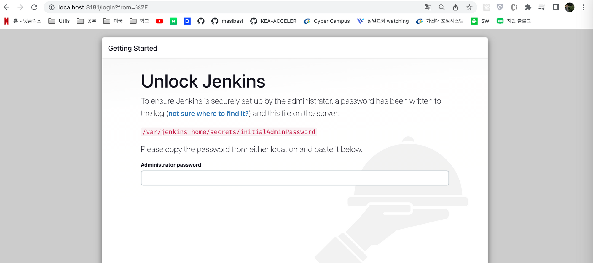 젠킨스 컨테이너에 접속하여 초기 비밀번호 확인