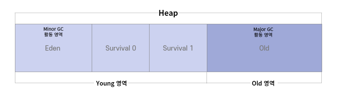JVM의 Heap 영역은 객체는 대부분 일회성이며, 메모리에 남아 있는 기간이 대부분 짧다는 전제로 설계되어 있다. 그렇게 때문에 객체가 얼마나 살아있냐에 따라서 Heap 영역 안에서도 영역을 나누게 되는데 Young, Old 영역 이렇게 두 가지로 나뉜다.