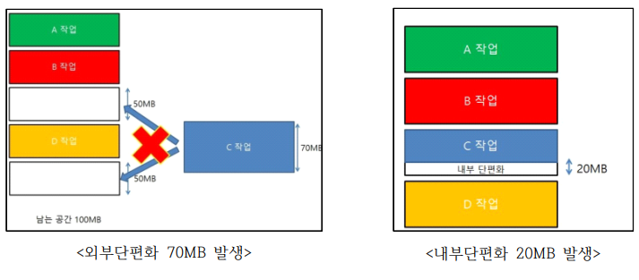 - 메모리 영역 사이사이에 사용하지않은 작은 메모리가 존재해서 총 메모리공간은 충분하지만 실제로 할당할 수 없는 상황