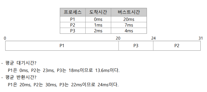 - 실행시간이 긴 프로세스는 순위가 밀려 무한 연기 상태가 될 수 있음(=기아상태 유발)