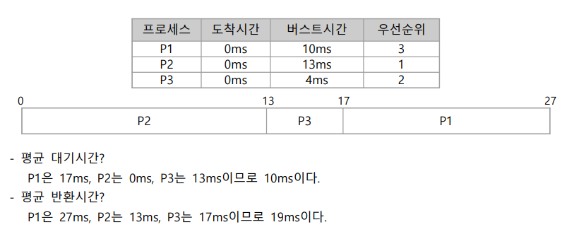 - 낮은 순위를 부여 받는 프로세스는 무한 연기 또는 기아 생태가 발생 할 수 있음.
