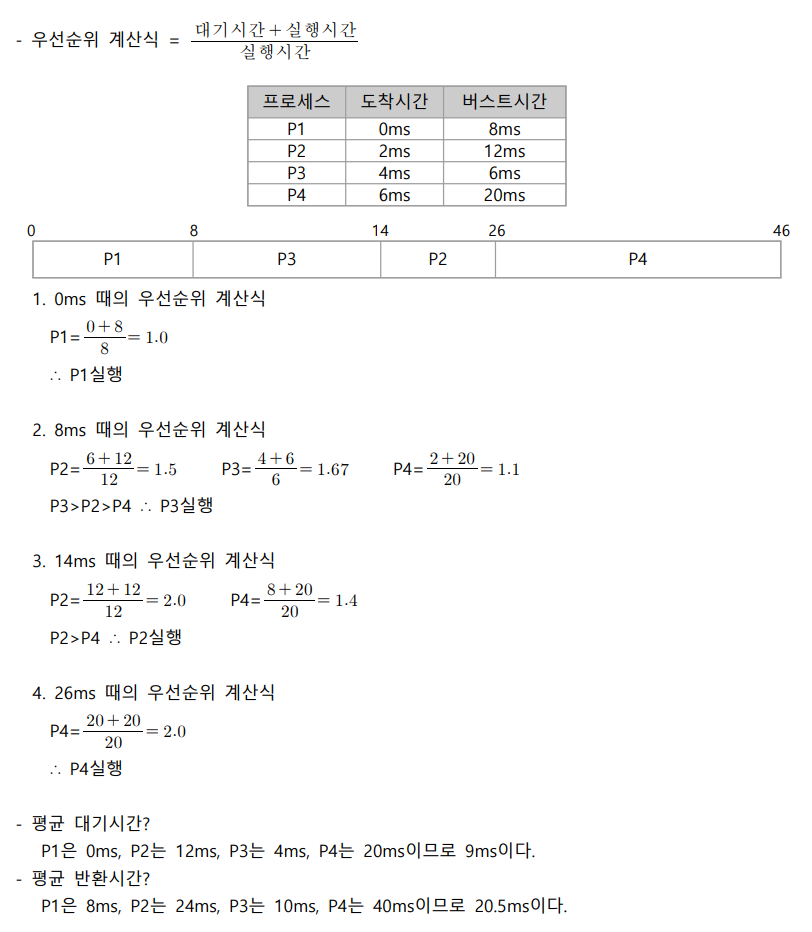 실행 시간이 긴 프로세스에게 불리한 SJF 기법을 보완하기 위한 것으로, 대기 시간과 실행 시간을 이용