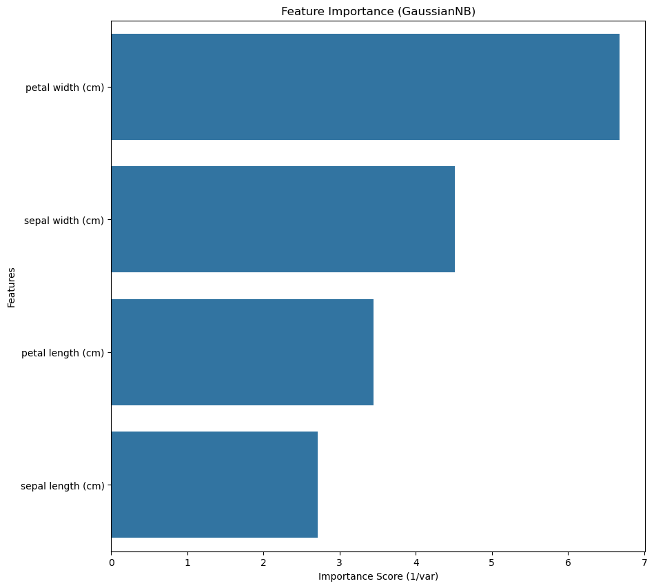 grid_search.best_estimator_ : 최적의 하이퍼파라미터를 적용한 가우시안 나이브 베이즈 모델accuracy_score(y, y_pred): 훈련 데이터에 대한 정확도 계산X)에 대해 평가하므로, 과적합(overfitting) 가능성이 존재함.train_test_split()을 사용하여 훈련/테스트 데이터로 나눈 후 검증해야 함.feature_importance = 1 / (best_gnb.var_).mean(axis=0)