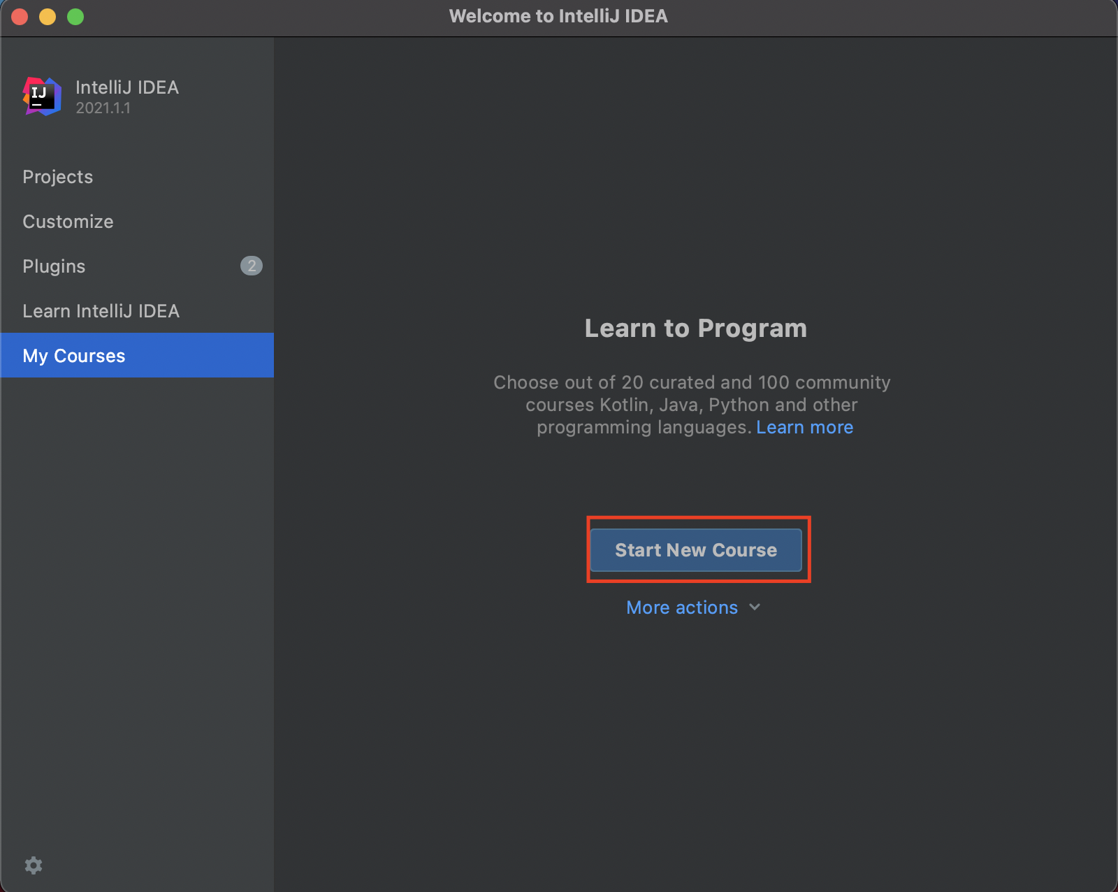 그러고 인텔리제이를 실행 후, My Courses 탭을 눌러 Start New Course를 클릭해줍니다.