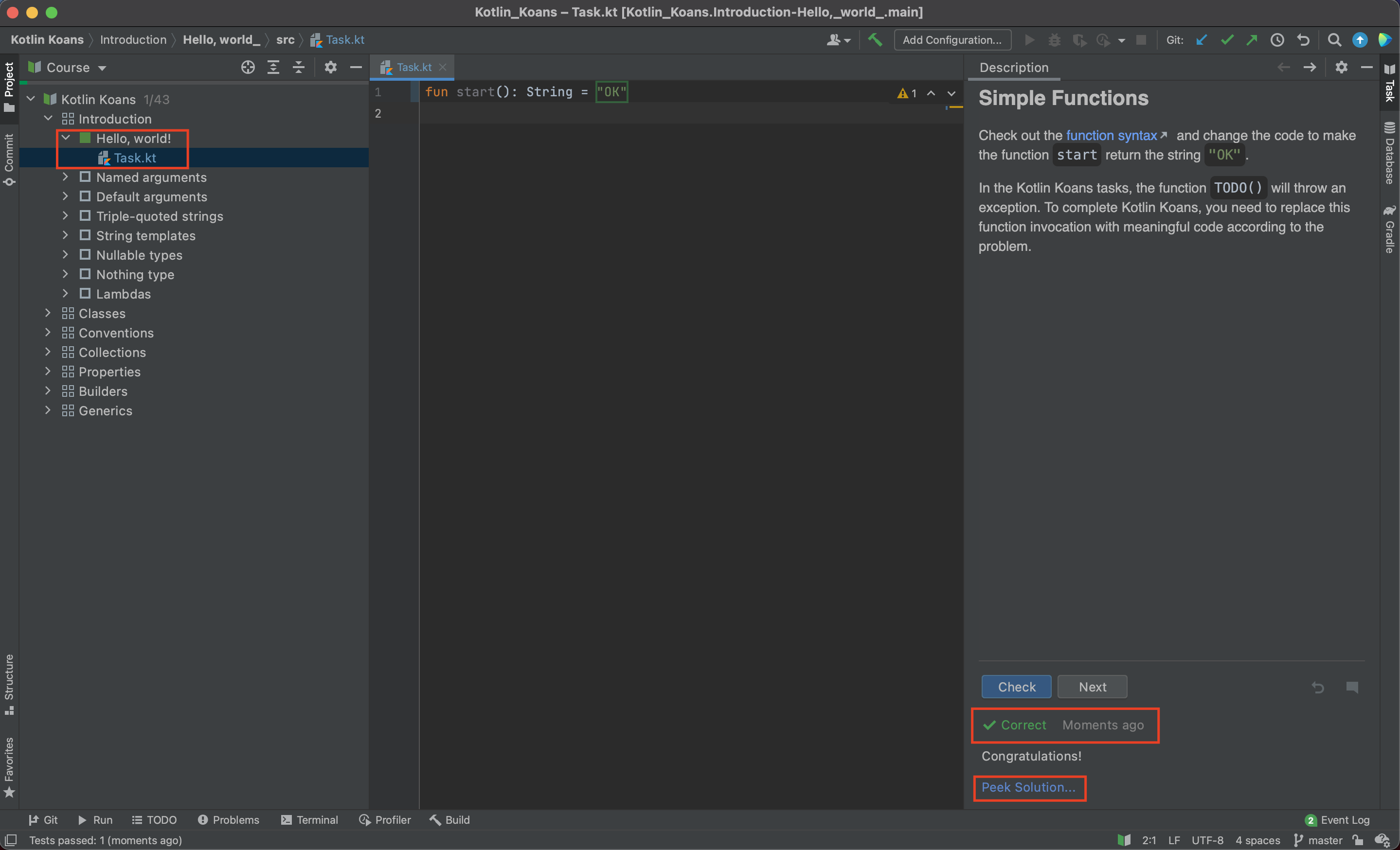 그 후, Kotlin Koans 과정을 시작해주시면 됩니다.