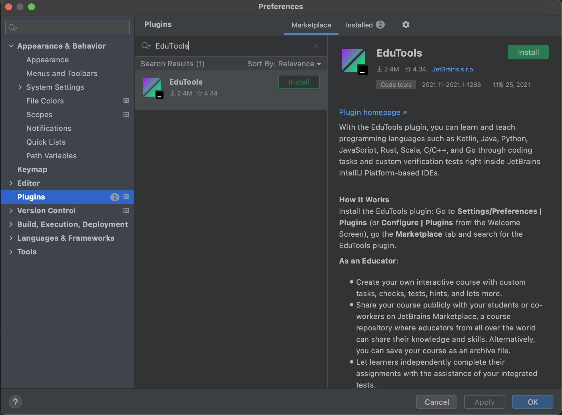 먼저 인텔리제이 플러그인 중 EduTools라는 것을 설치해줍니다.