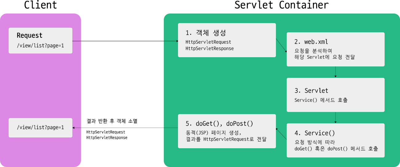 | 7. 객체 소멸 결과를 클라이언트로 전송 후 HttpServletRequest, HttpServletResponse 객체 소멸 |