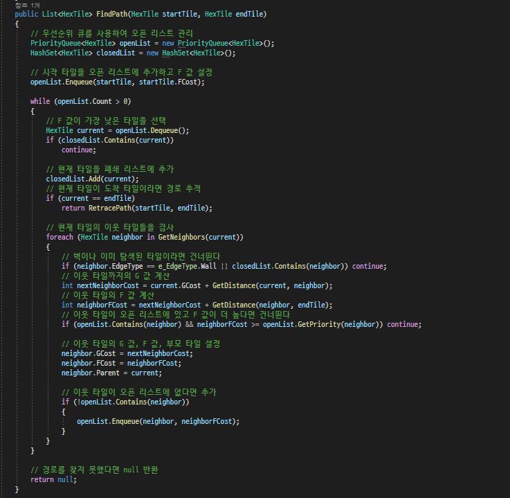 FindPath는 주어진 시작 타일과 목적지 타일 간의 최단 경로를 찾습니다. 이를 위해 우선순위 큐와 폐쇄된 타일 집합을 사용하여 탐색하며, 각 타일의 G 값(출발 지점부터의 이동 비용), H 값(목적지까지의 예상 이동 비용), 그리고 F 값(G 값과 H 값의 합)을 계산합니다.