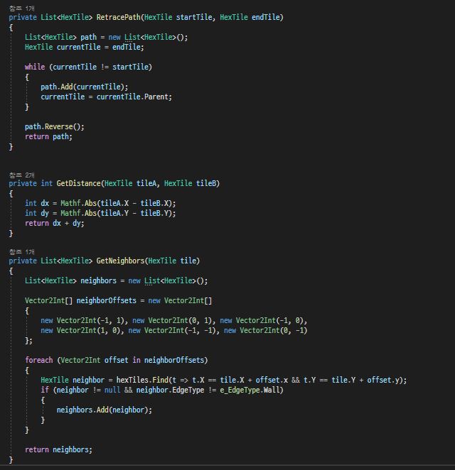 GetNeighbors 메서드는 주어진 타일의 이웃 타일을 찾아 반환합니다. 여기서는 헥스 그리드의 특성에 따라 헥스 타일 주변에 있는 이웃 타일을 찾습니다.