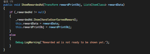 ShowRewardedAd 함수는 Start에서 인스턴스되고 등록이 끝난 RewardedAd를 호출하여 보상형 광고를 표시합니다. 광고가 표시된 후, 광고 시청 완료 이벤트가 발생하면 HandleUserEarnedReward 콜백 함수가 호출됩니다.