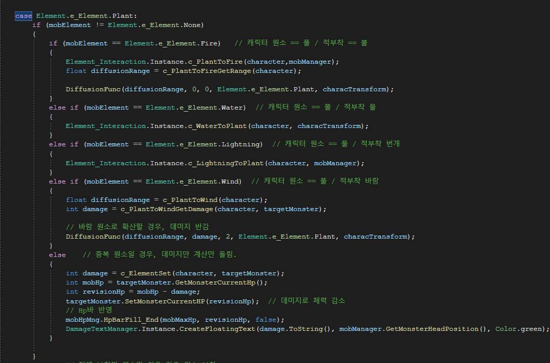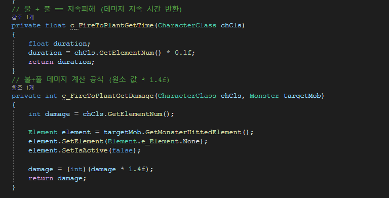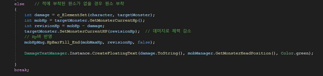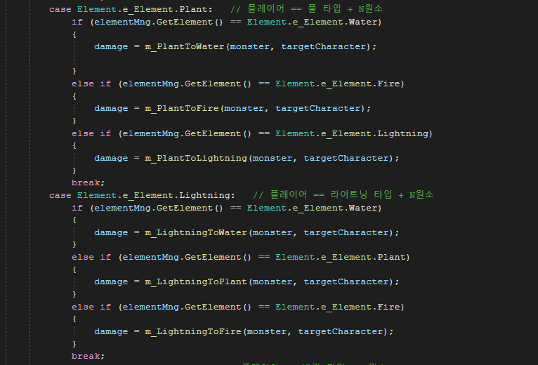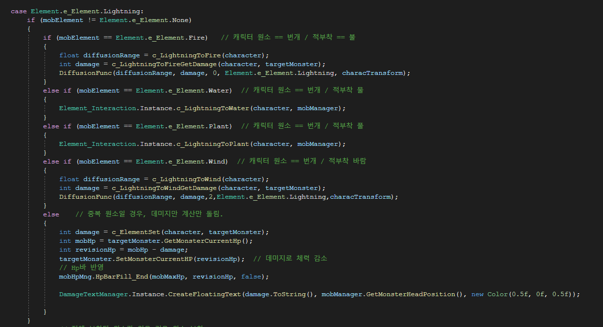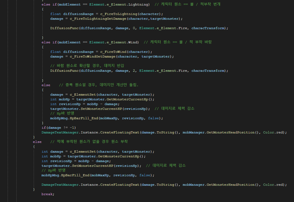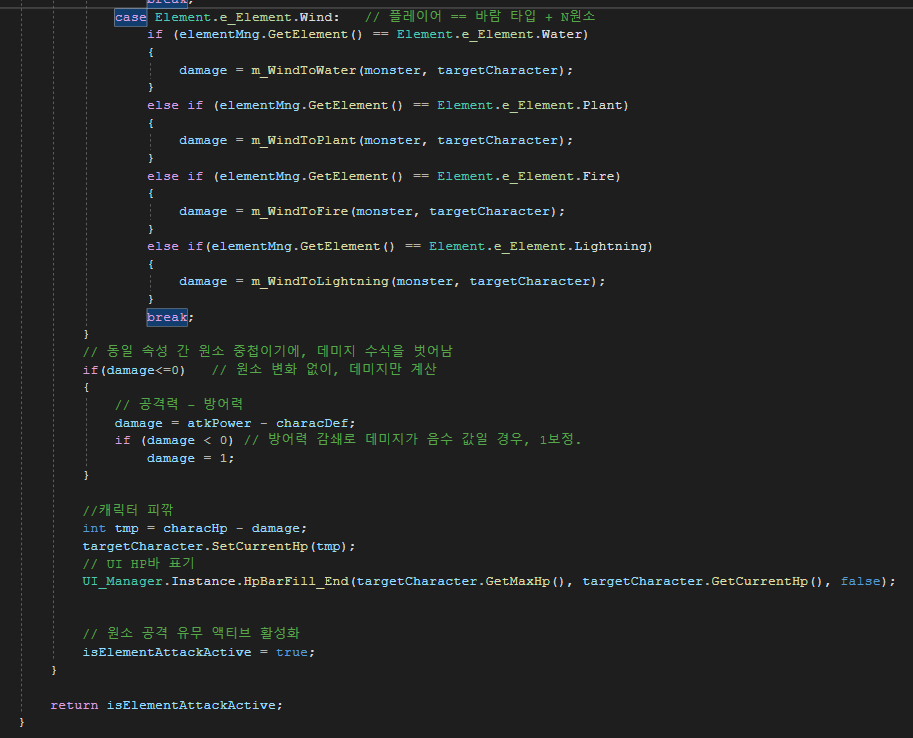 이후, 타겟이 된 몬스터와 플레이어 캐릭터의 각 원소 상태를 Get 하여 비교 후, 알맞는 함수를 호출합니다.