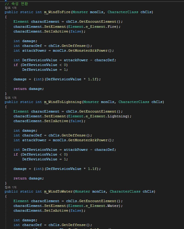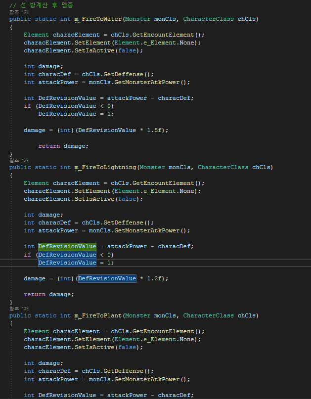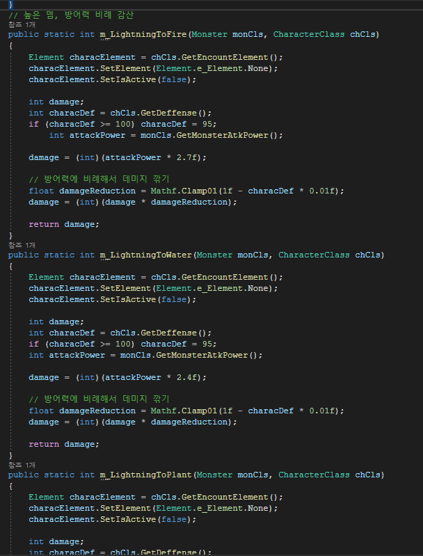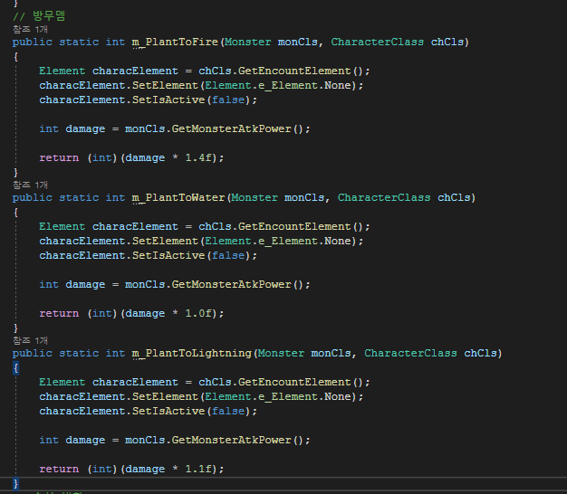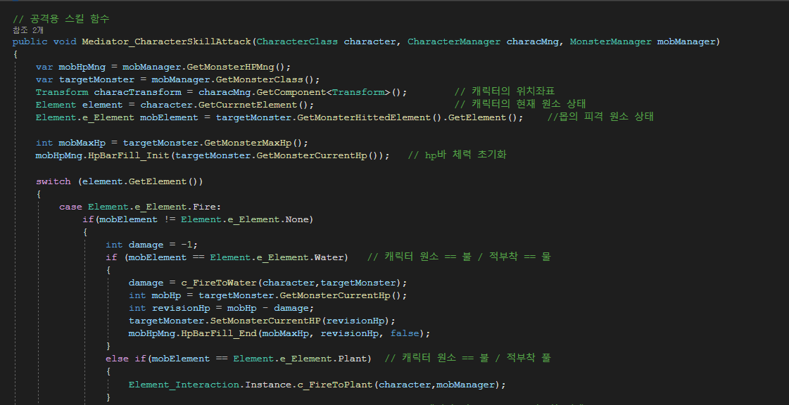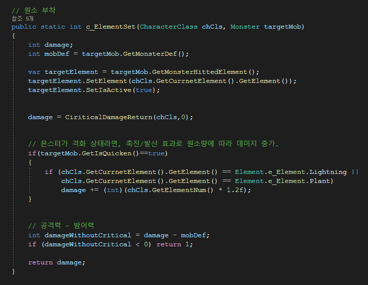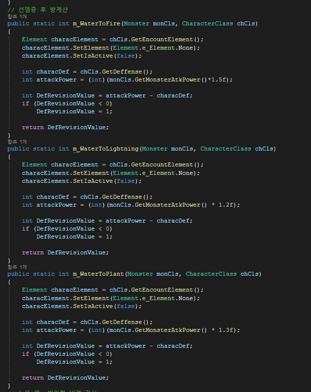 이후, 타겟이 된 몬스터와 플레이어 캐릭터의 각 원소 상태를 Get 하여 비교 후, 알맞는 함수를 호출합니다.
