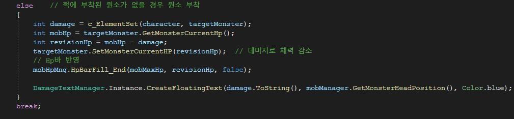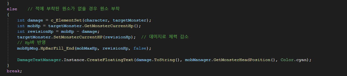 캐릭터의 현재 원소를 기준으로 swich 문으로 분기하여, 현재 적의 원소 상태에 따라서, 원소 효과를 일으킵니다.