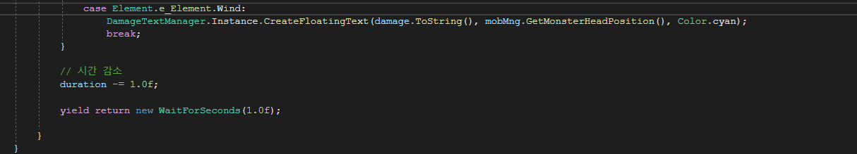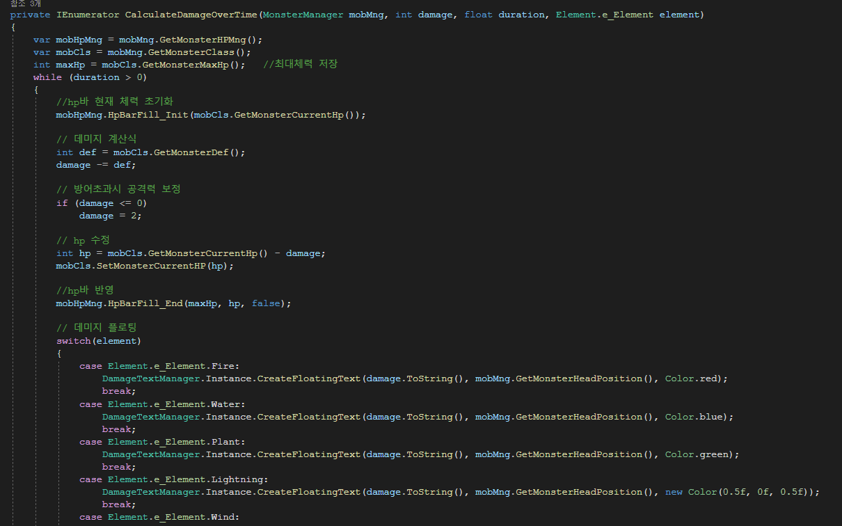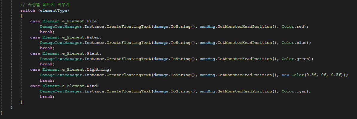 CalculateDamageOverTime() 함수의 경우에, 불-풀 원소 반응 뿐만 아니라 지속 시간 데미지를 주는 모든 로직에 사용되기에, 속성별로 다른 색상의 데미지 플로팅 문자를 출력하도록 해줍니다.