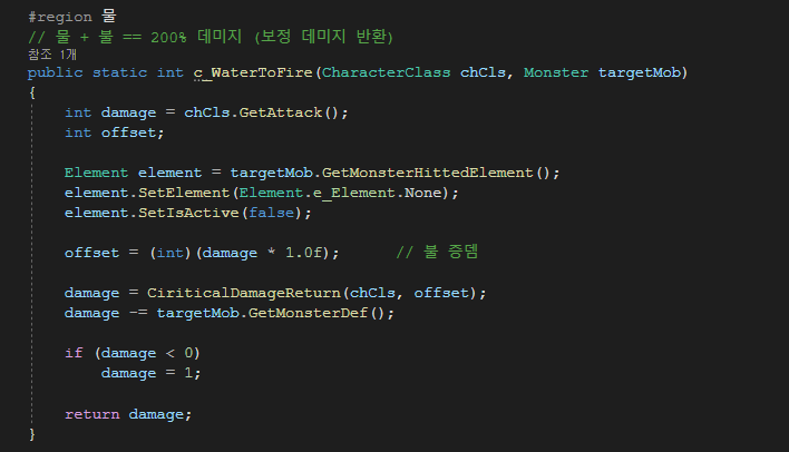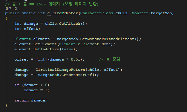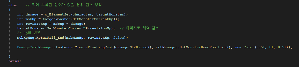 이러한 원소 데미지 공식에 의거하여, 얻은 damage값만큼 캐릭터의 체력을 깎는 것으로 로직을 종료합니다.