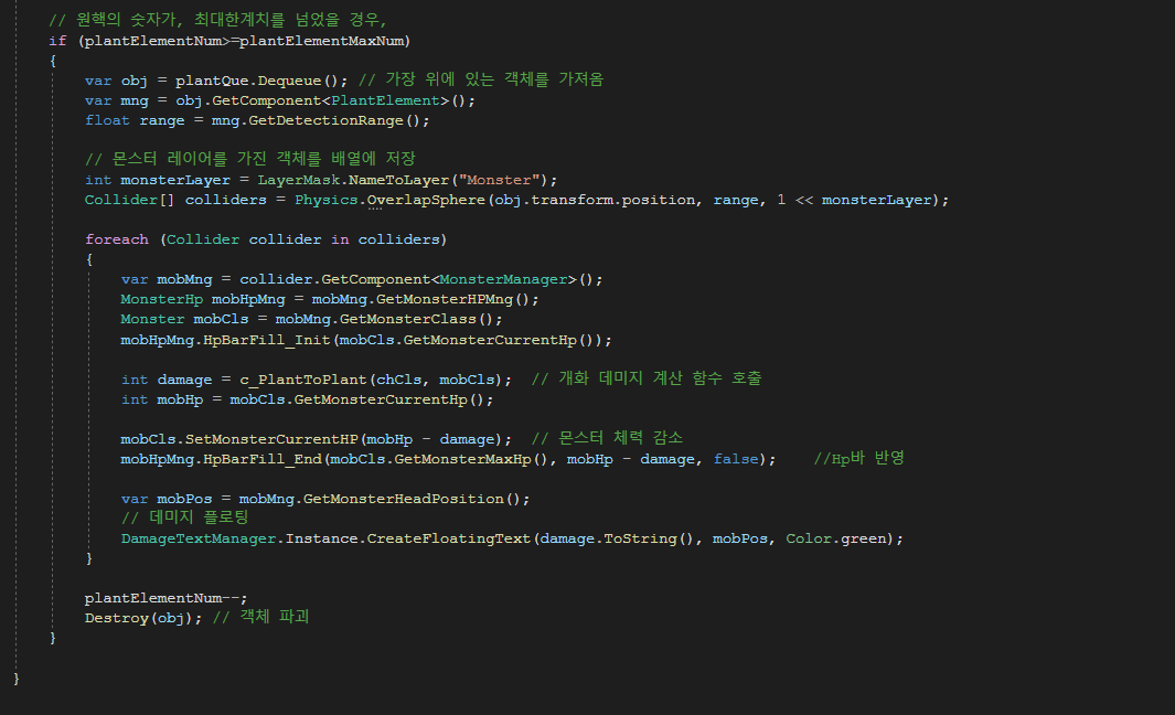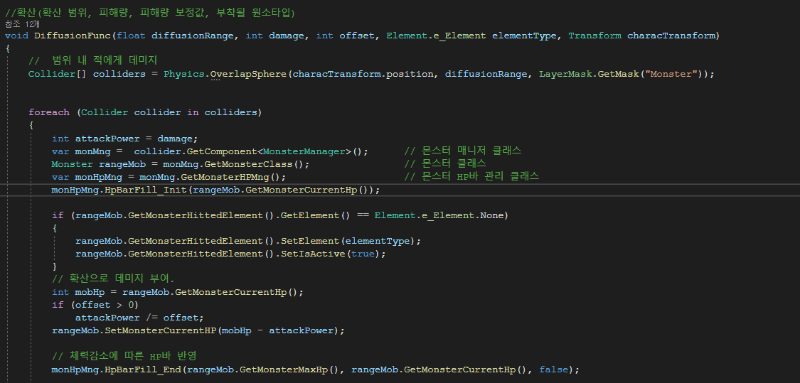 확산 범위 만큼 OverlapSphere 메서드를 이용하여, 범위 내의 적들에게 피해량과 피해 보정값을 이용하여 데미지를 주고 원소 타입을 매개 변수로 받아서 원소를 부착 시키고, 데미지를 줍니다.
