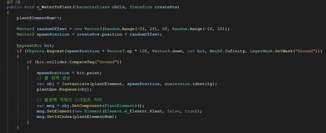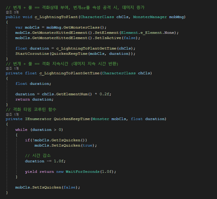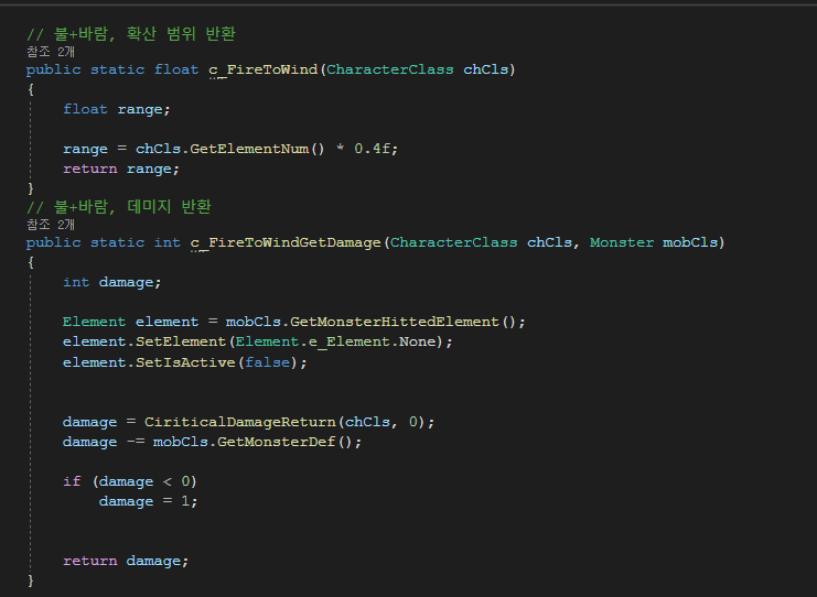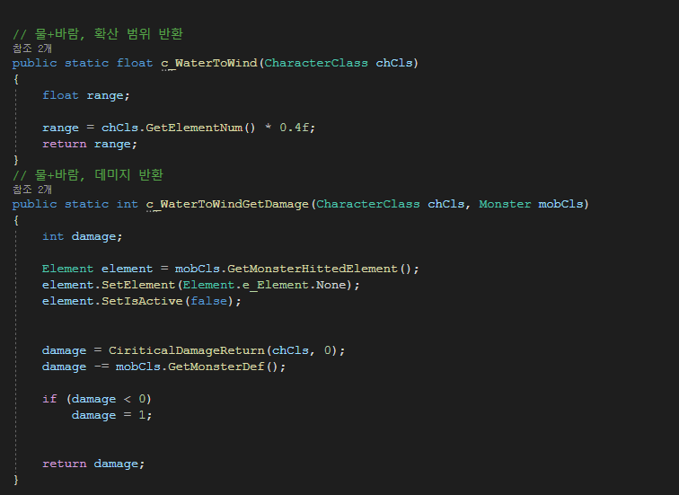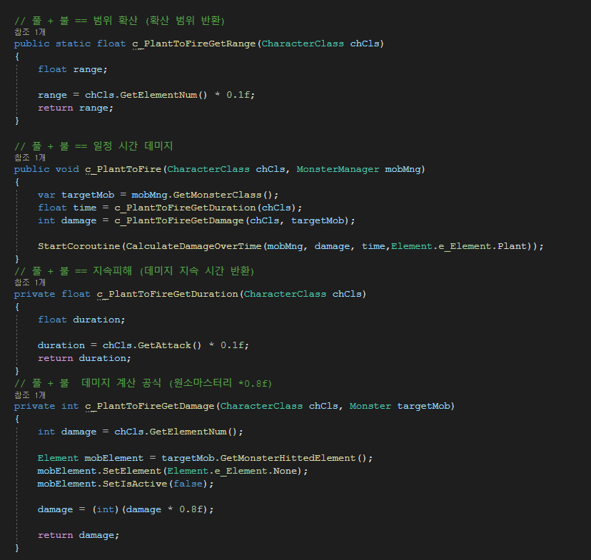 이러한 원소 반응 효과는 캐릭터와 마찬가지로 Element_Interaction클래스에 구현되어, static을 이용하여, 정적 메서드에 접근하여 구현됩니다.