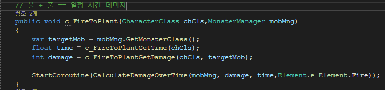 화염 속성의 경우에는 FireToPlant 함수를 호출하여, 지속데미지를 주며,