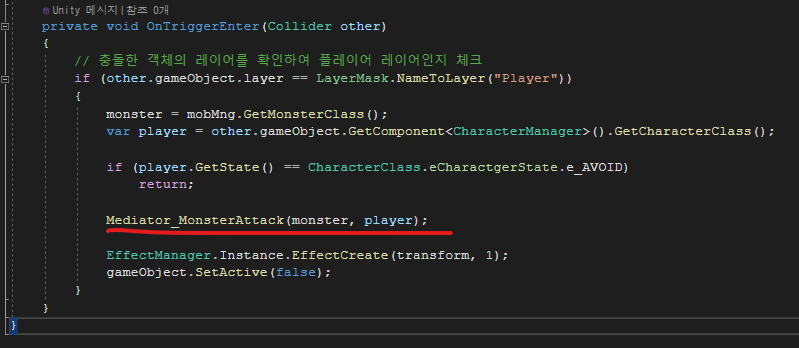 마찬가지로 OnTriggerEnter를 통해서, 콜라이더의 충돌을 감지하고 충돌체가 Player 레이어에 해당할 경우에, 중재자 패턴을 통해서 데미지 계산 함수를 호출합니다.