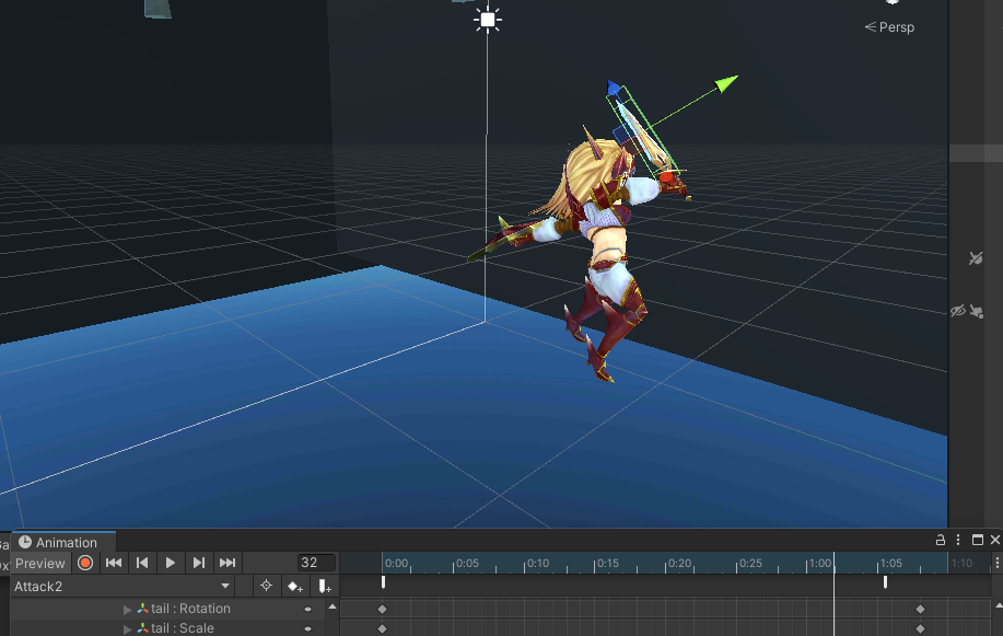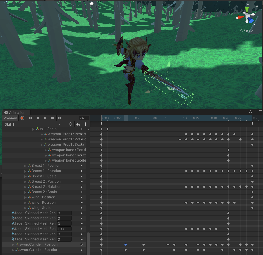 평타 공격과 마찬가지로, 애니메이션 동작의 프레임 사이사이에 콜라이더의 위치를 조정하여, 박스 콜라이더가 매끄럽게 검을 따라갈 수 있도록 하였습니다.