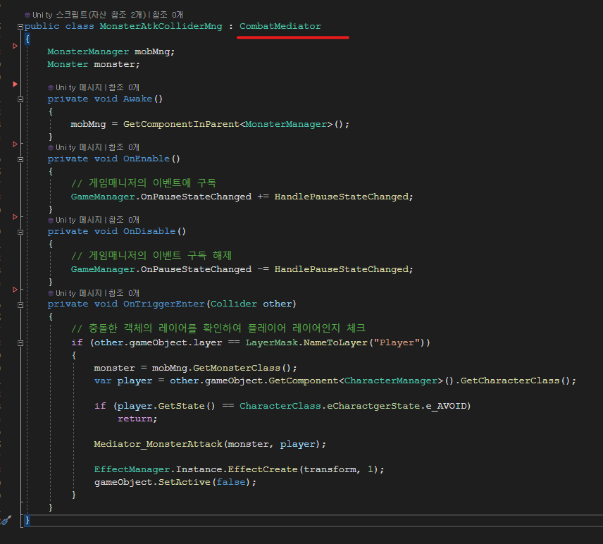 해당 클래스는 OnTriggerEnter가 함수가 구현되어, 콜라이더의 충돌을 감지할 수 있으며, 플레이어의 검 오브젝트에 부착된 콜라이더를 이용해, Monster 레이어를 판정하고 상속 받은 중재자 패턴을 통해 데미지 함수를 호출합니다.