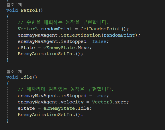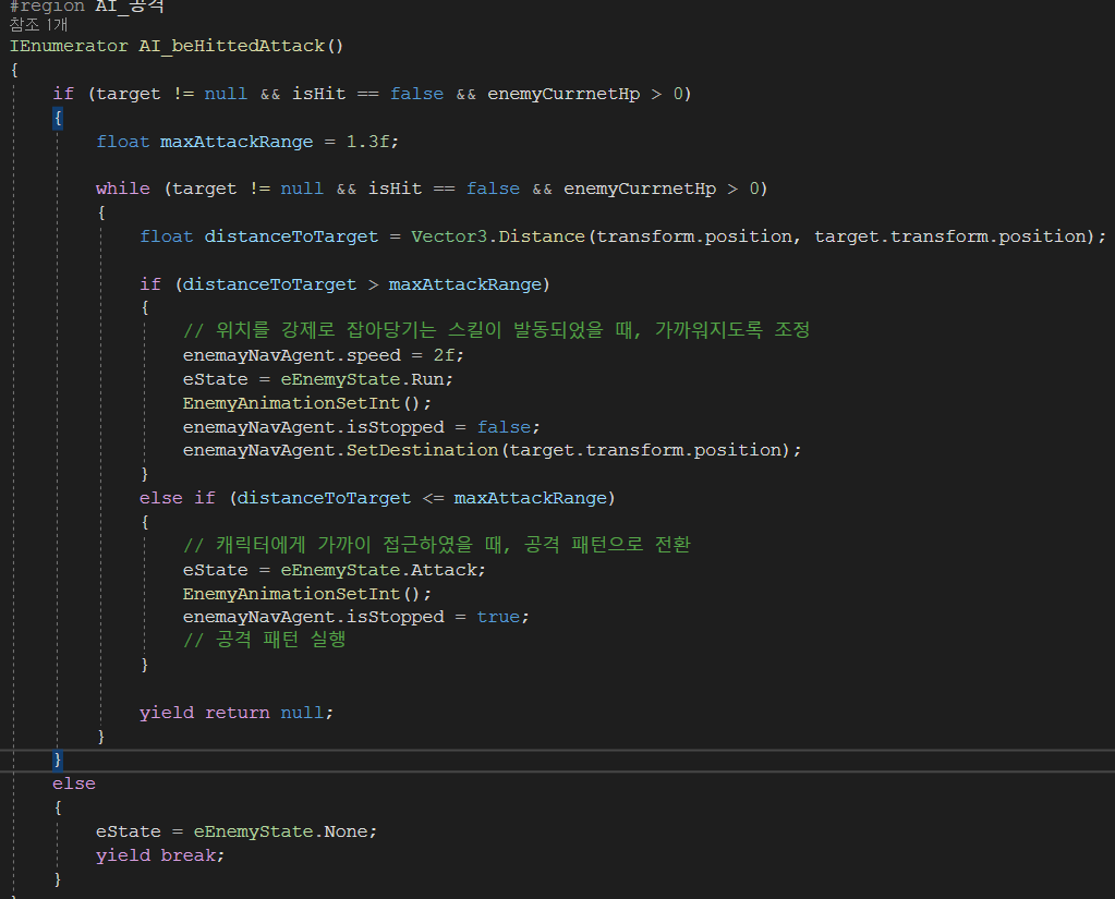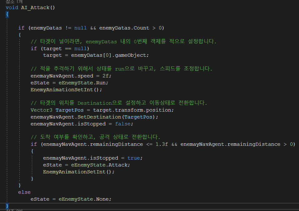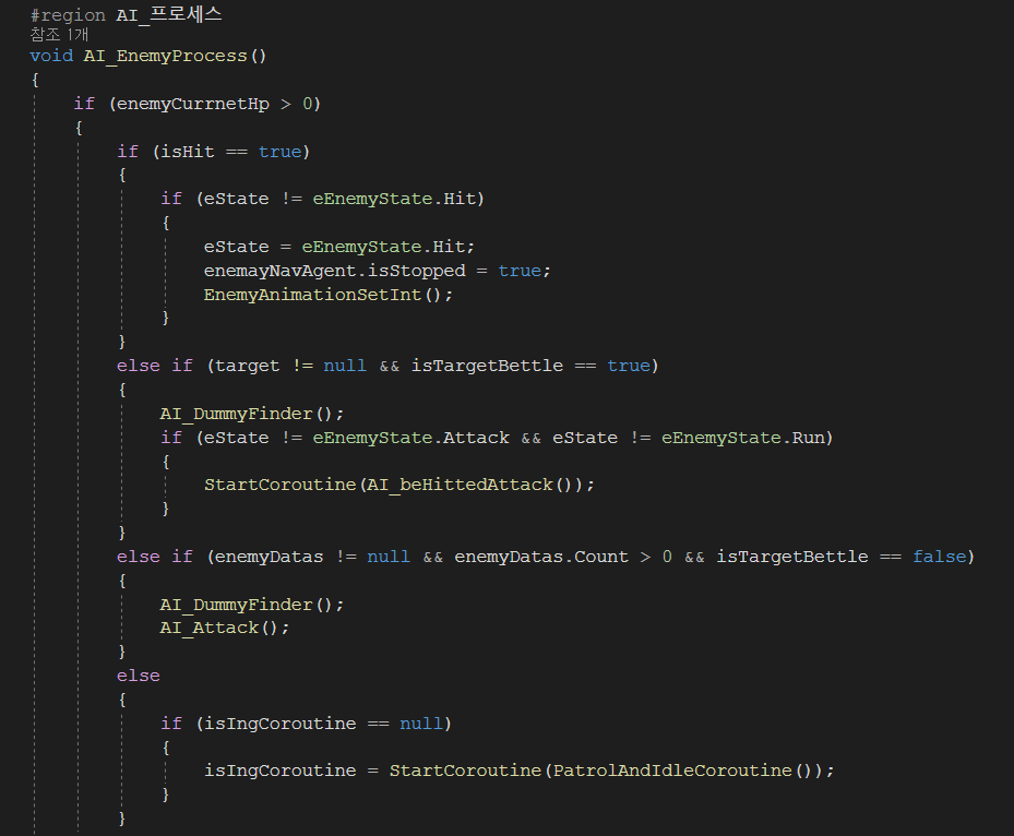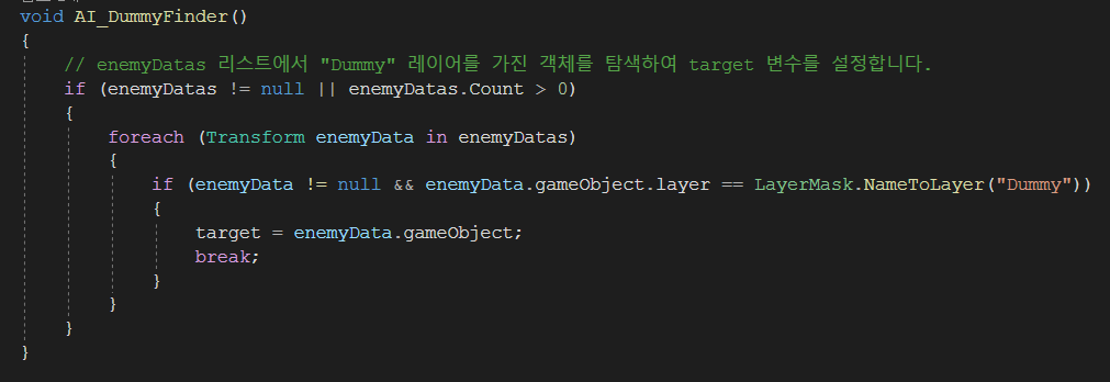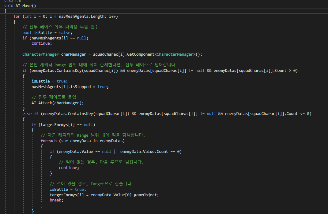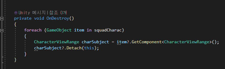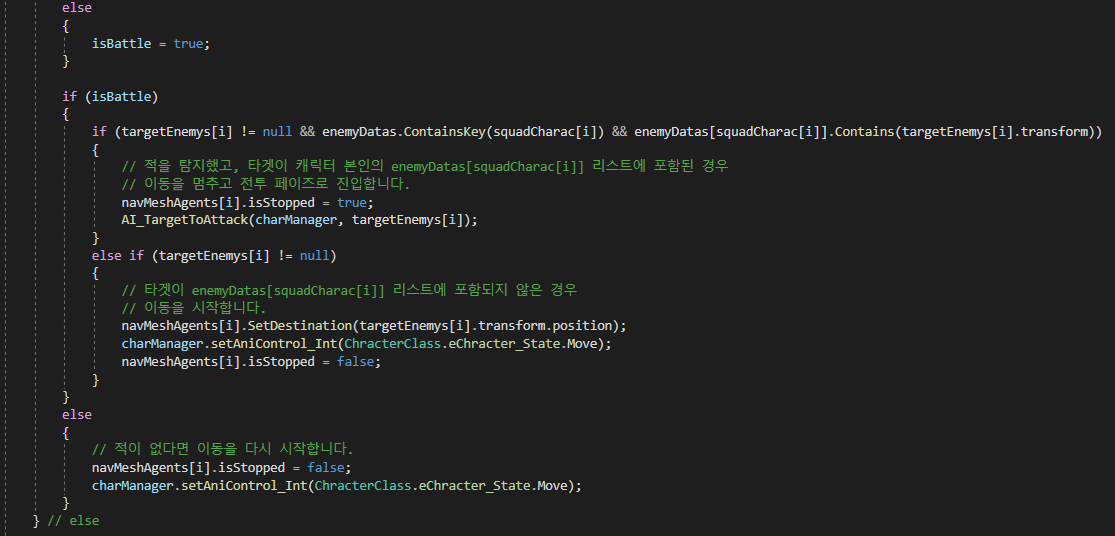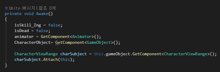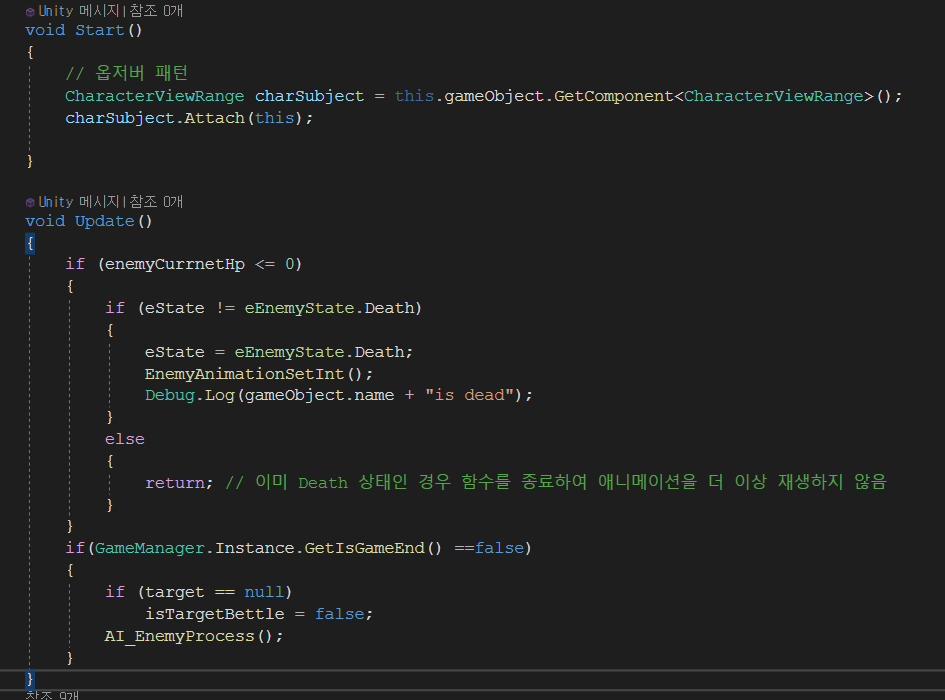CharacterViewRange클래스는 Subject로써, enemy를 탐지할 때마다 구독자인 Observer들에게 데이터들을 넘겨주고, Observer들은 이렇게 받은 데이터를 이용하여 전투 AI를 구현합니다.