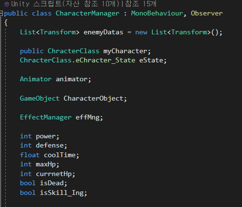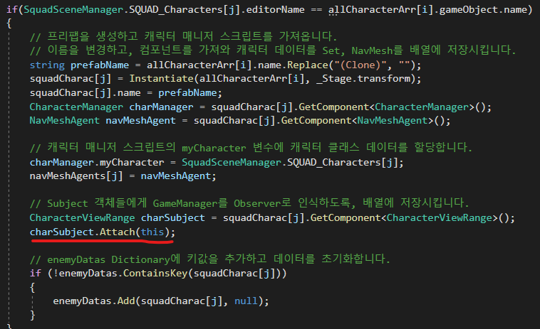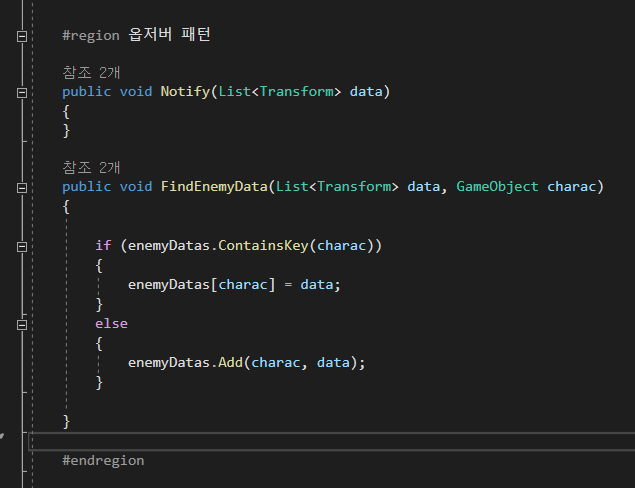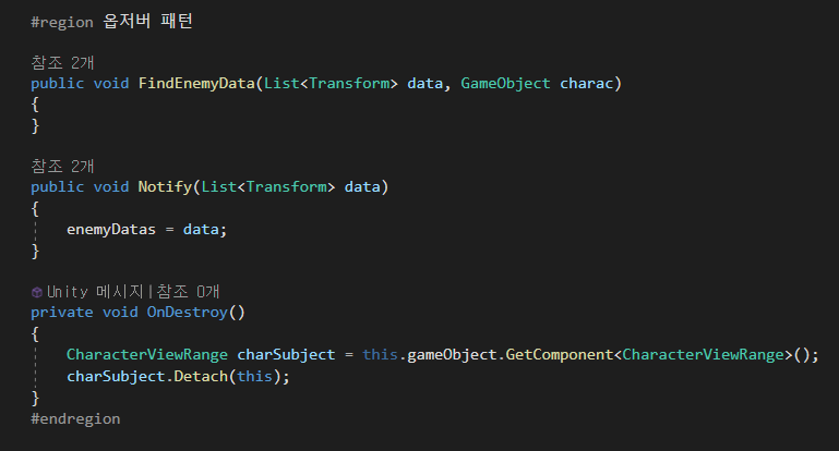 GameManager와 CharacterManager 클래스에서 ViewRange가 탐색한 해당 enemyDatas를 필요로하며, 이는 옵저버 패턴을 이용하여 데이터를 주고 받습니다.