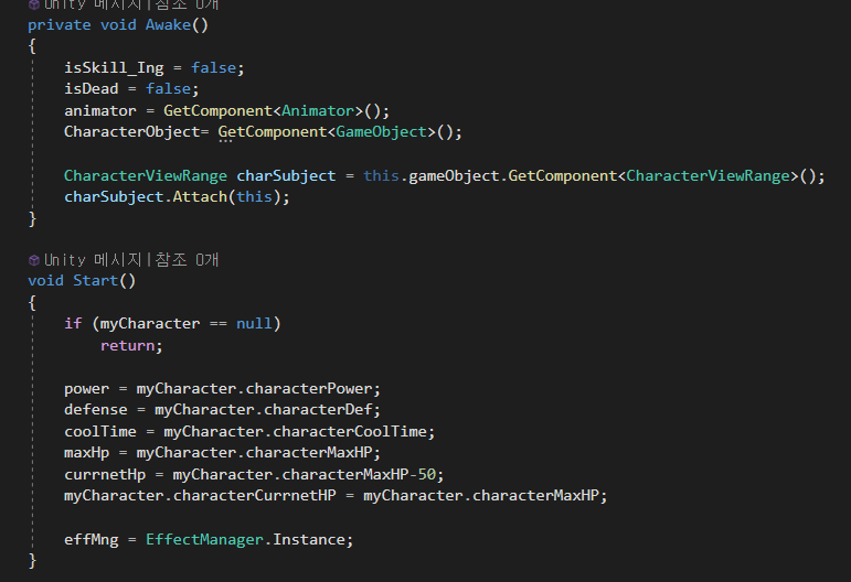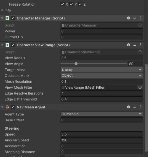 캐릭터는 모두 캐릭터의 프로세스를 관리하는 CharacterManager와 ViewRange라는 적을 탐지하는 클래스를 보유하고 있으며,