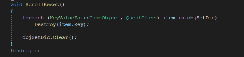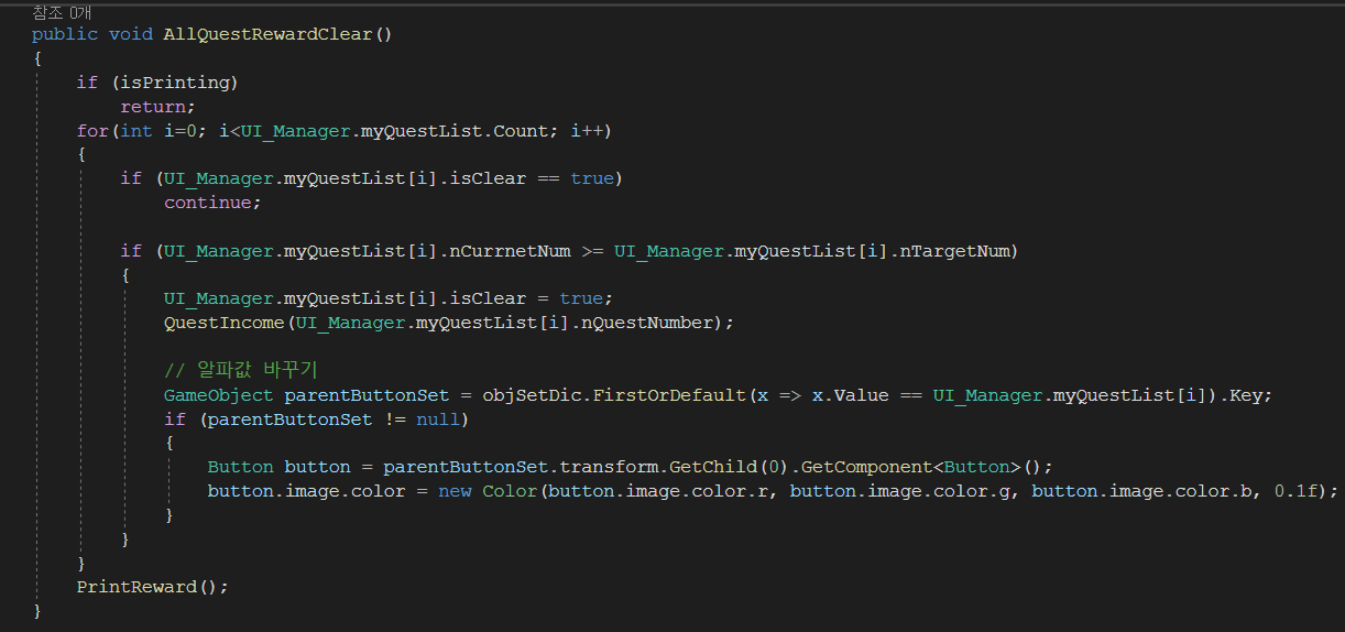 AllQuestRewairdClear함수는 현재 보상 획득이 가능한 모든 퀘스트들을 순회하며 완료 처리를 하고 한 번에 보상을 얻도록 만드는 함수입니다.