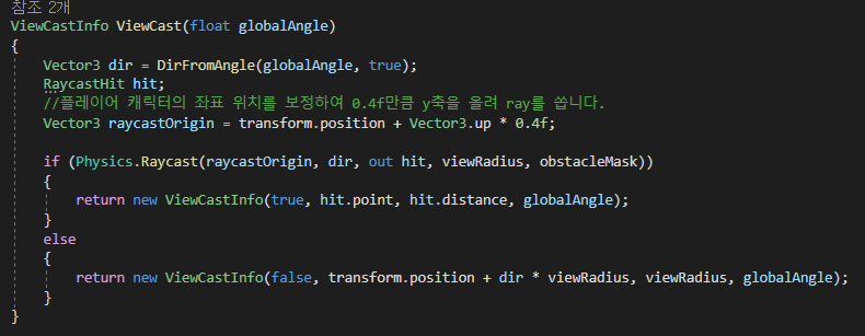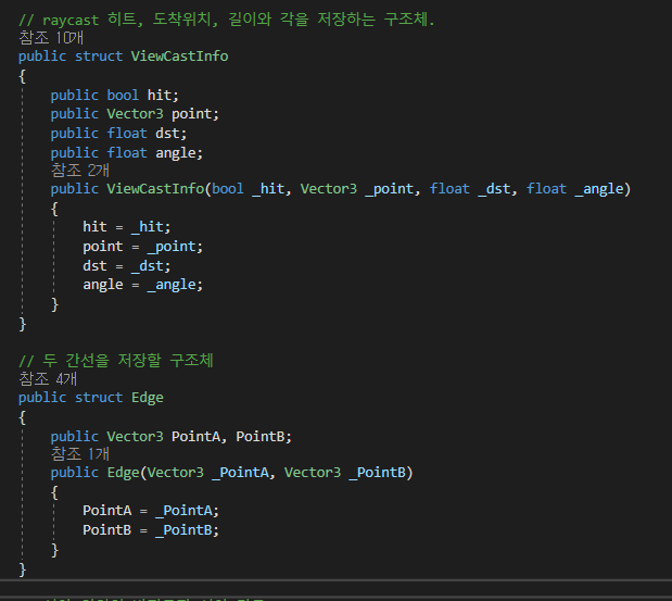 ViewCastInfo는 raycast의 결과를 저장하는 구조체입니다. 시야 영역의 레이캐스트 결과를 저장하여 후속 처리에 사용됩니다.