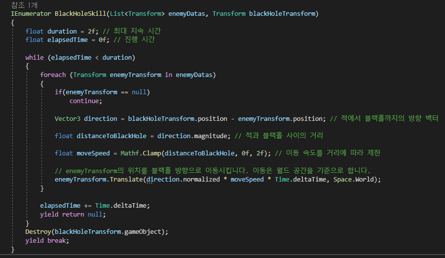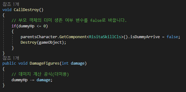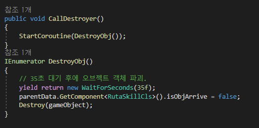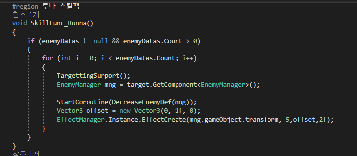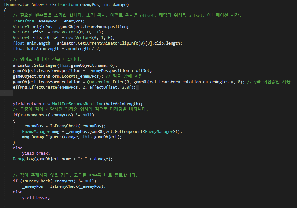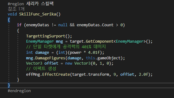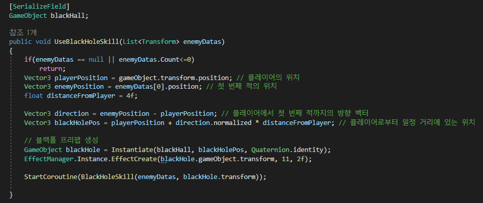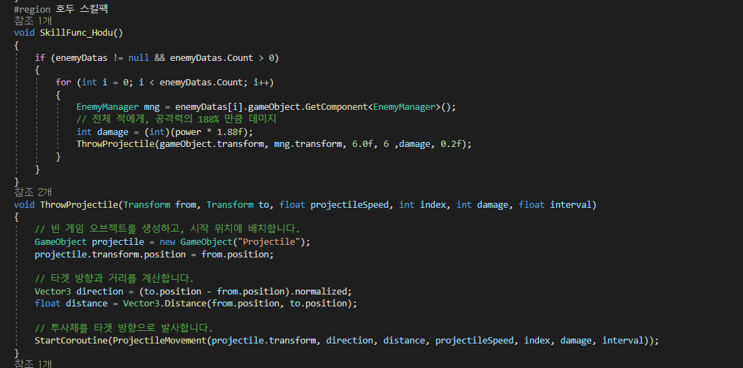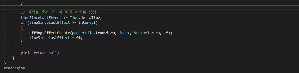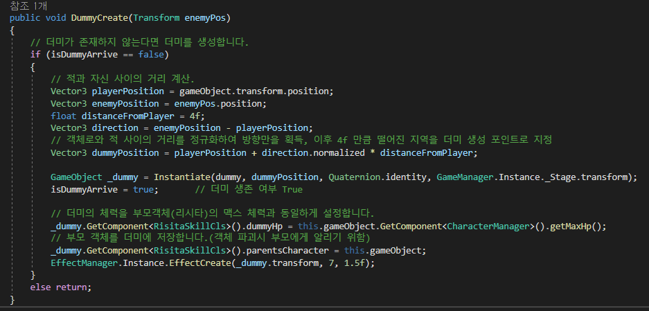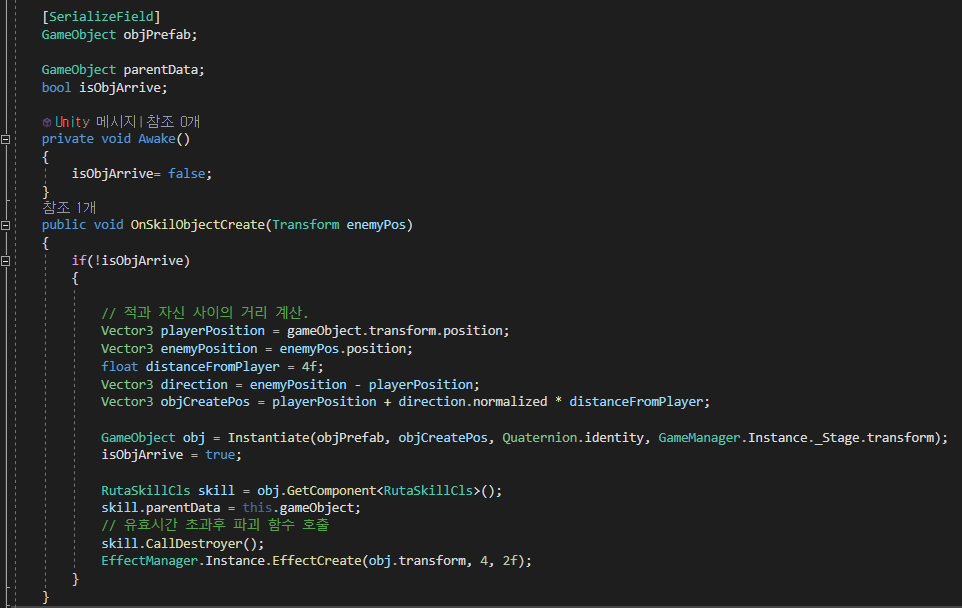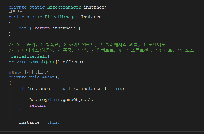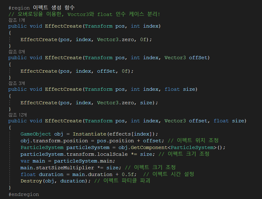 오버로딩을 이용하여, vector3와 flaot 인수의 케이스를 분리하였으며, 이렇게 입력받은 파라미터를 이용하여, 인덱스 번째의 이펙트 파티클을 생성하고, 위치와 크기를 조정하며, 이펙트의 duration을 설정하여 해당 시간 후에 객체를 파괴합니다.