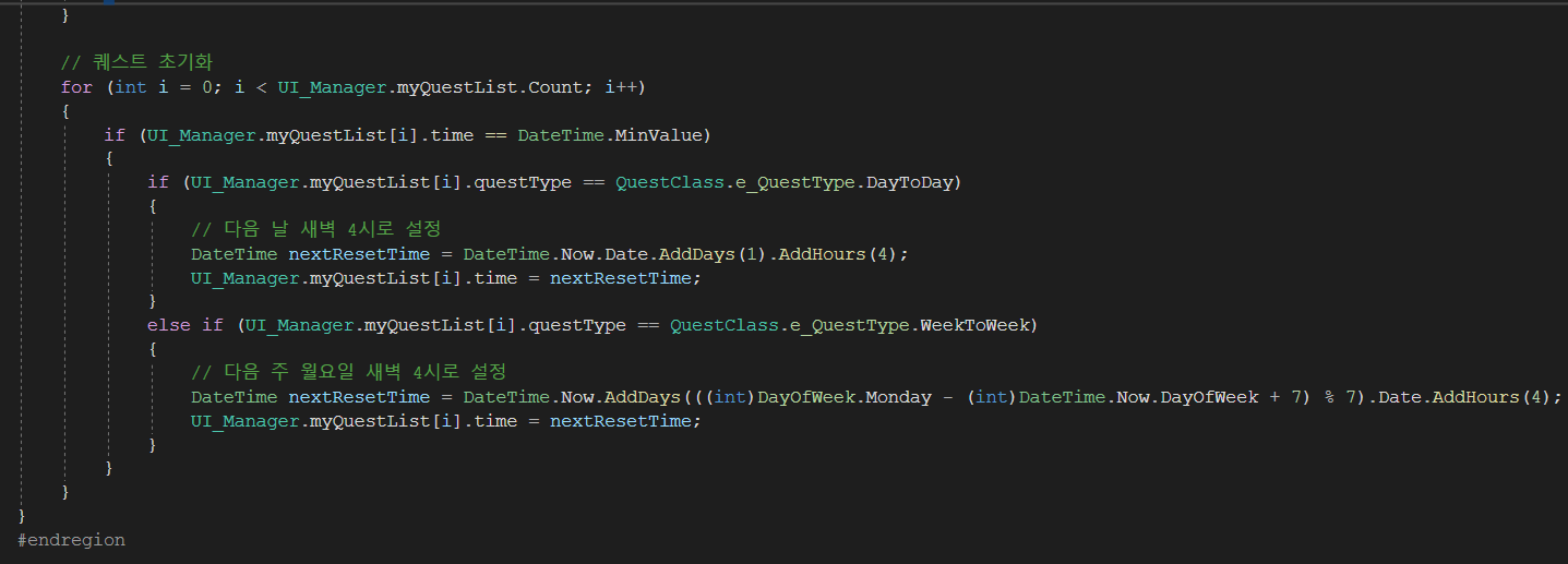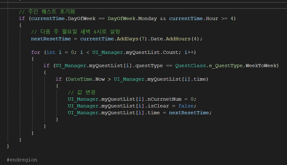 현재 시간과 리셋 시간을 대조하고 시간이 초과되었다면, 퀘스트 데이터를 초기화하고 시간을 다음주 월요일 새벽 4시로 변경해줍니다.