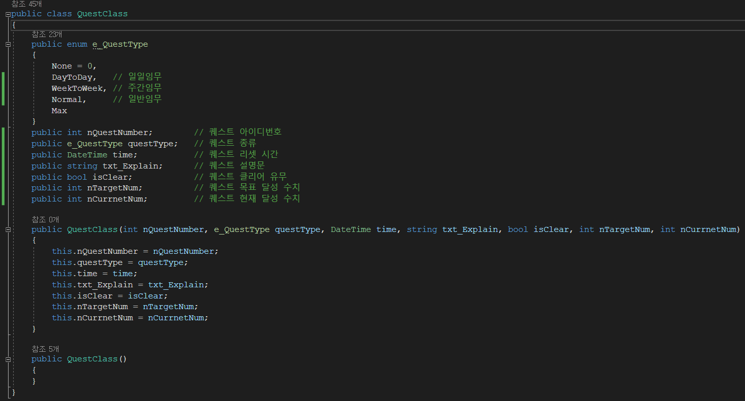 퀘스트 클래스는, 캐릭터 클래스와 마찬가지로 퀘스트를 관리하는 클래스 타입의 자료형입니다.
