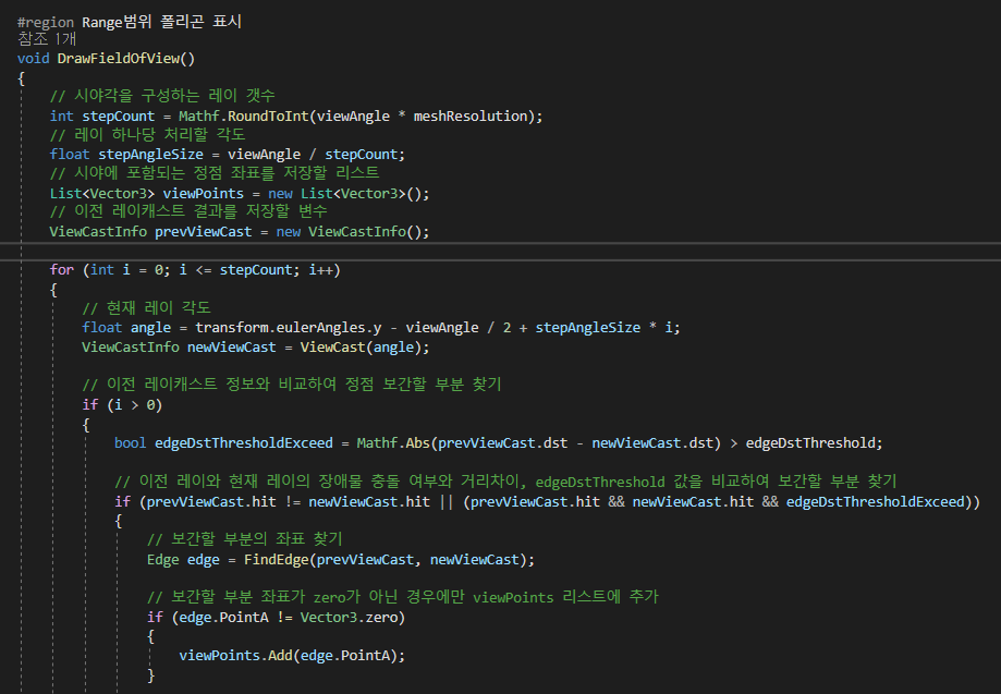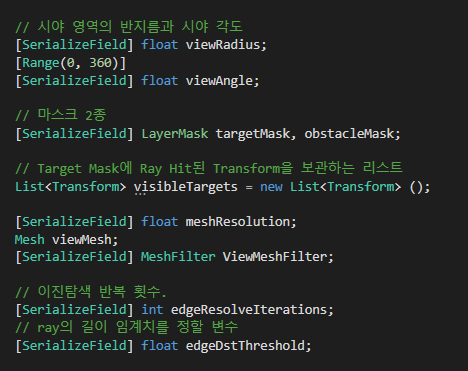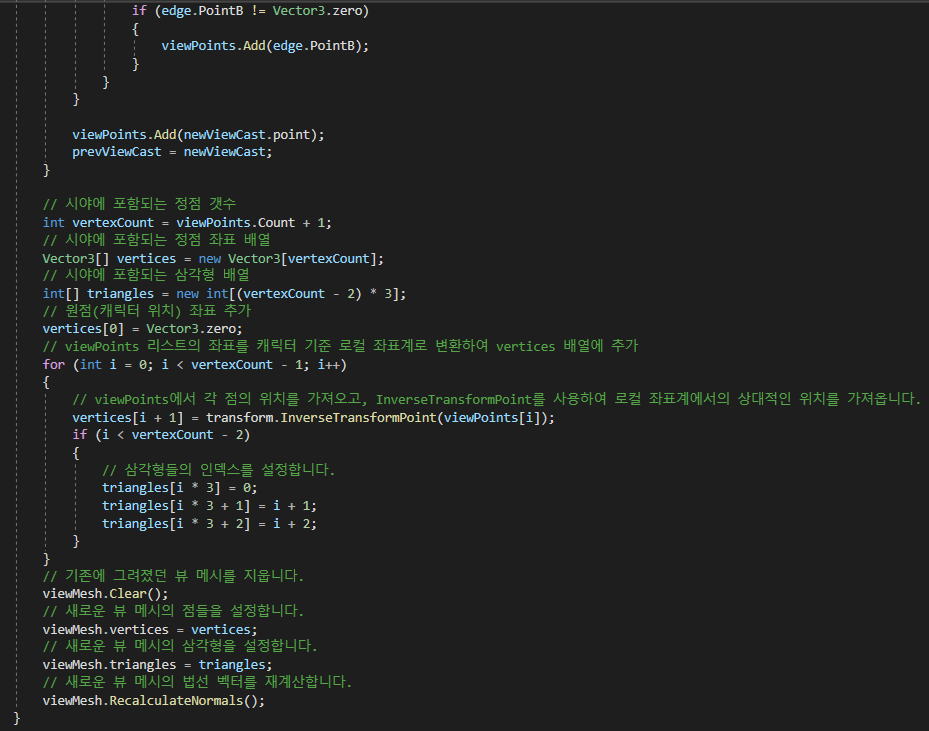 Start에서는 viewMesh 변수를 새로운 Mesh 객체로 초기화합니다. 그리고 ViewMeshFilter 컴포넌트의 mesh 속성을 초기화된 viewMesh로 설정합니다. 이렇게 함으로써 viewMesh를 렌더링할 수 있는 MeshFilter를 준비합니다.