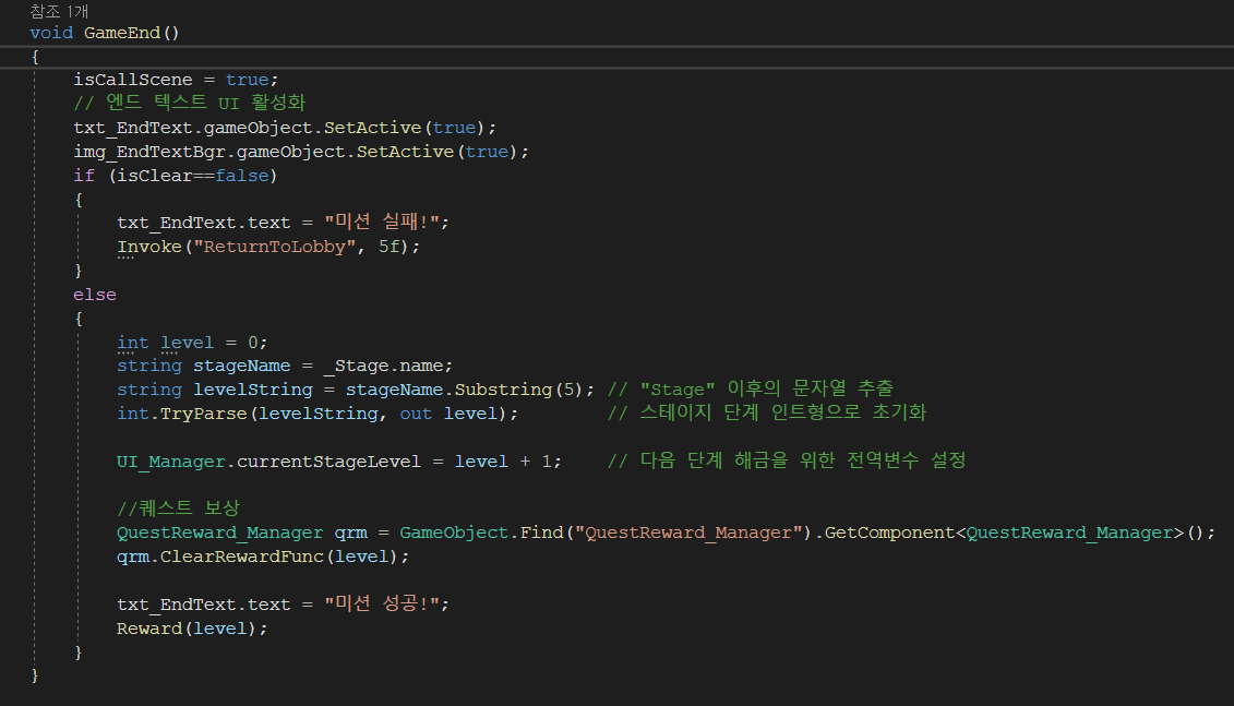 ClearRewardFunc는 스테이지 클리어 후에 각 스테이지의 레벨을 인자로 받아서 관련된 퀘스트를 호출하기 위하여 ID인덱스를 인자로 넘겨서 함수를 호출합니다.