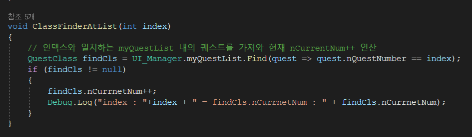ClassFinderAtList는 인덱스를 인자로 받은 후에, 파라미터와 일치하는 myQuestList의 원소를 가져와 해당 원소의 nCurrentNum 값을 가산해주는 함수입니다.