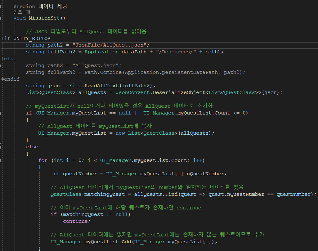 데이터 세팅 함수는 모든 퀘스트 데이터를 가지고 있는 오리지널 데이터인 AllQuest.json파일과 플레이어의 퀘스트 데이터를 관리하는 myQuestList를 비교하여 추가되는 값이 있을 경우, 리스트에 데이터를 반영하여 퀘스트 데이터를 최신 데이터로 유지하도록 하는 함수입니다.