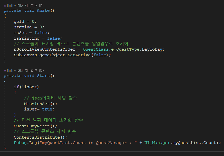 start에서는 json데이터로 관리되는 플레이어의 퀘스트 데이터 파일을 불러와 세팅합니다.