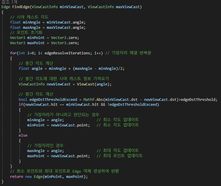 Edge는 두 개의 간선(선분)을 저장하는 역할을 합니다. 각 간선은 시작점과 끝점의 좌표를 가지고 있습니다. 이 구조체는 주로 시야 영역의 가장자리를 나타내는 두 개의 간선을 저장하고 반환하는 데 사용됩니다.