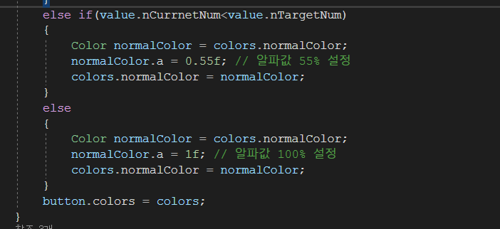 마지막으로 버튼의 알파값을 수정하여, 퀘스트가 클리어 되었음을 알립니다.