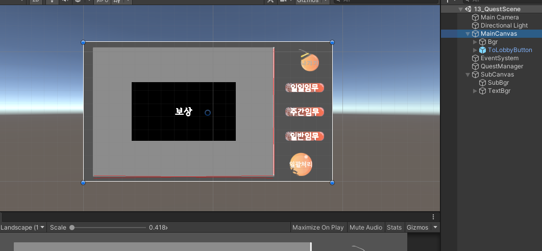 퀘스트 씬에는 총 두 개의 캔버스와 하나의 매니저 클래스로 이루어져 있습니다.