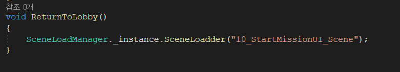 스쿼드씬을 로드하는 버튼은 Additive 형태로 신을 호출하여, 스쿼드 씬에서 나가기를 누를 경우, 다시 StartMission 씬으로 돌아올 수 있도록 코드를 구성하였습니다.