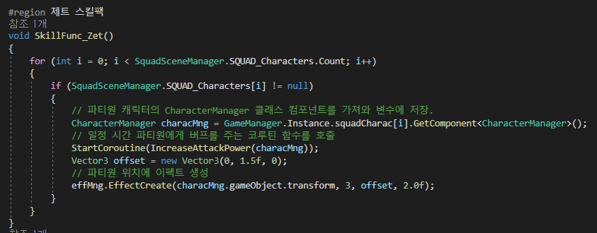 상단의 반복문은 스쿼드 파티 내에 같은 이름을 가지는 캐릭터 있는지 검사하는 코드입니다.